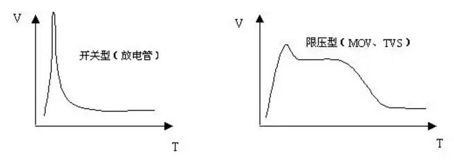 理想的通信线路防雷器件应是电容小、残压低、通流大、响应快。显然表中的器件都不理想,放电管几乎可以用于所有的通信频率,但其防雷能力较弱;MOV电容较大,只适用于音频传输,TVS耐雷电流的能力较弱只能起辅助保护作用。不同的防雷器件在电流波的冲击下其残压波形也不同,如图所示。根据残压波形的特点,可将避雷器分为开关型和限压型,也可以将两种复合在一起,扬长避短。